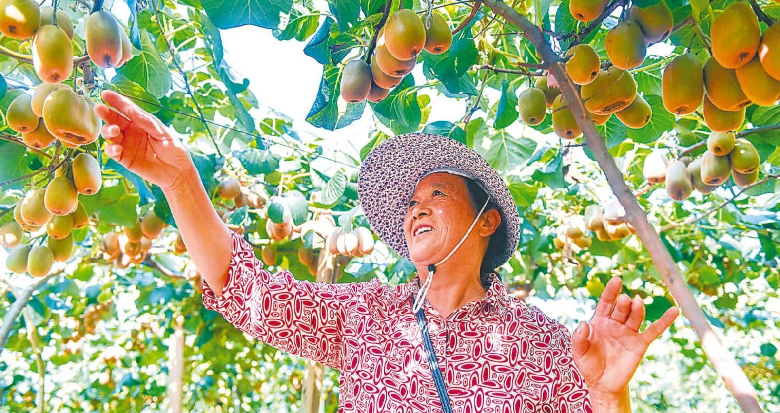 在明光市自來(lái)橋鎮(zhèn)的獼猴桃采摘園,農(nóng)戶在查看獼猴桃長(zhǎng)勢(shì) 王緒波 尹思源 攝