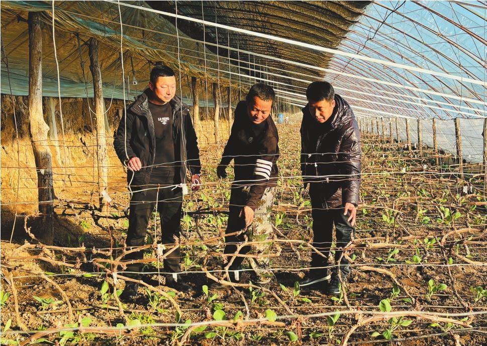 王爺陵村黨總支書記馬立朋(右)和村民王艷生(中)一起查看葡萄越冬情況 記者 曲宏 攝