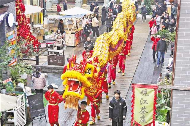 重慶高新區(qū)走馬古鎮(zhèn)用非遺點(diǎn)燃游客的熱情:春節(jié)期間,舞龍隊(duì)、舞獅隊(duì)、花船、腰鼓隊(duì)等在古鎮(zhèn)里巡游;當(dāng)?shù)卮迕褡跃幾匝莸纳徍嵨琛Ⅳ~燈舞等吸引了十里八鄉(xiāng)的村民前來(lái)打卡。