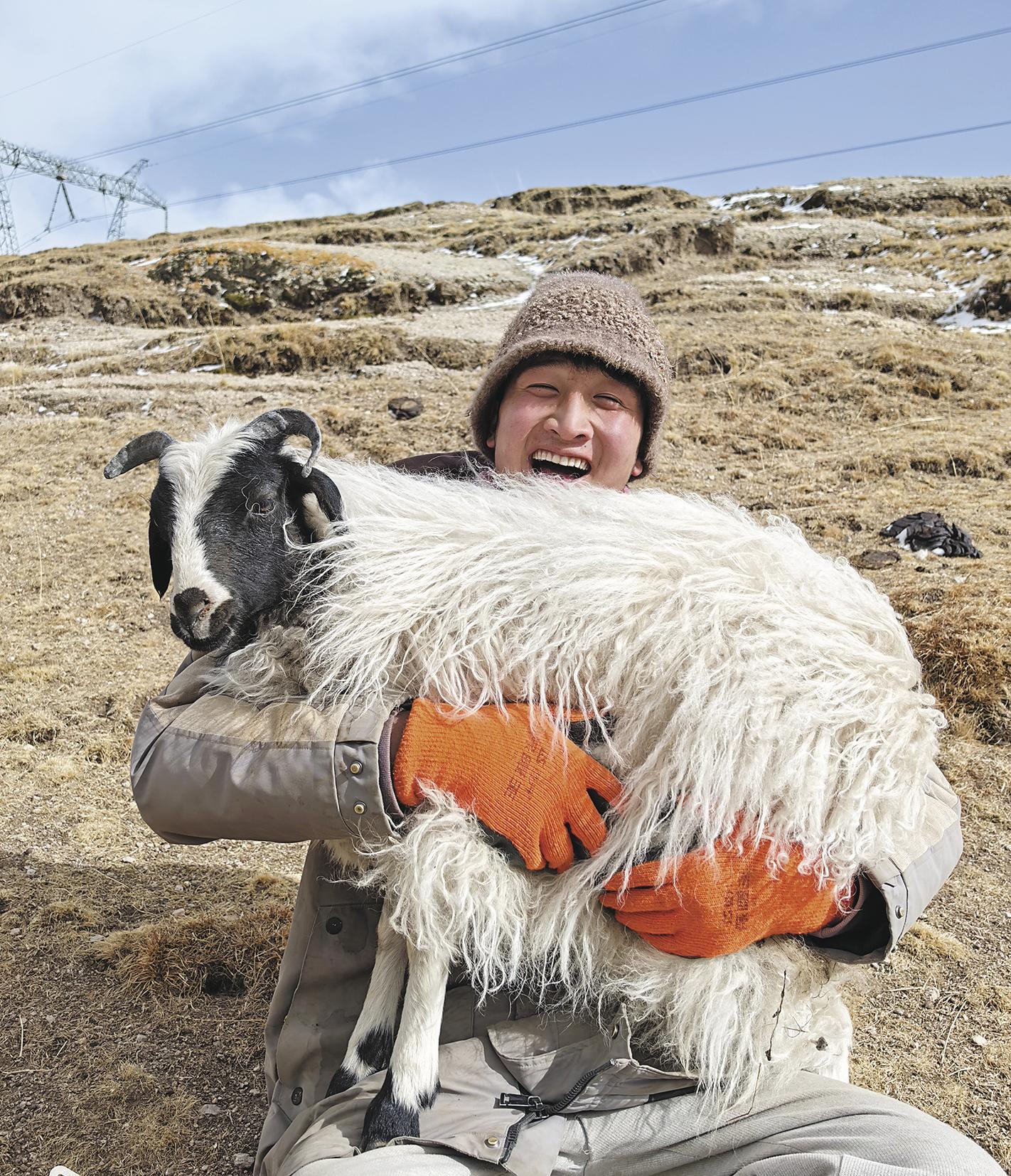 寧夏村村民拉保和他的羊羔。記者 丁玉梅 攝