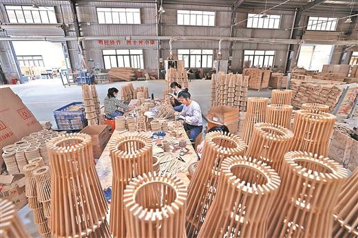在融安縣融嘉工藝有限公司生產(chǎn)車間,工人正在生產(chǎn)竹制燈罩。記者 彭華 通訊員 譚凱興 攝