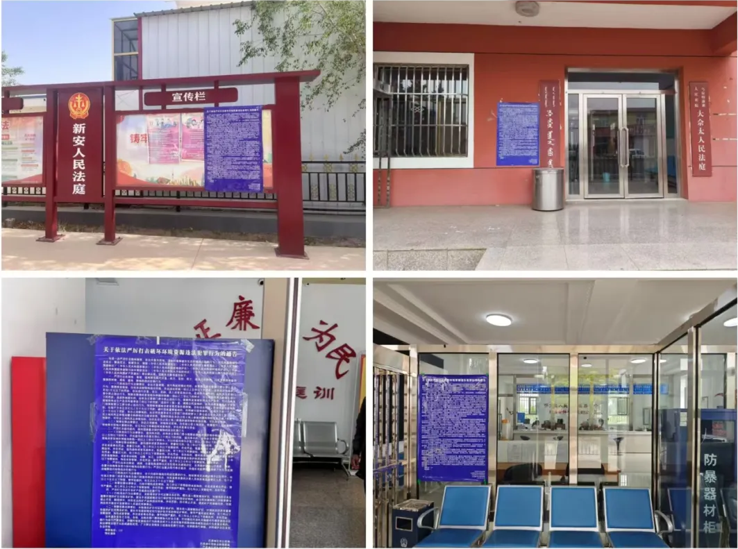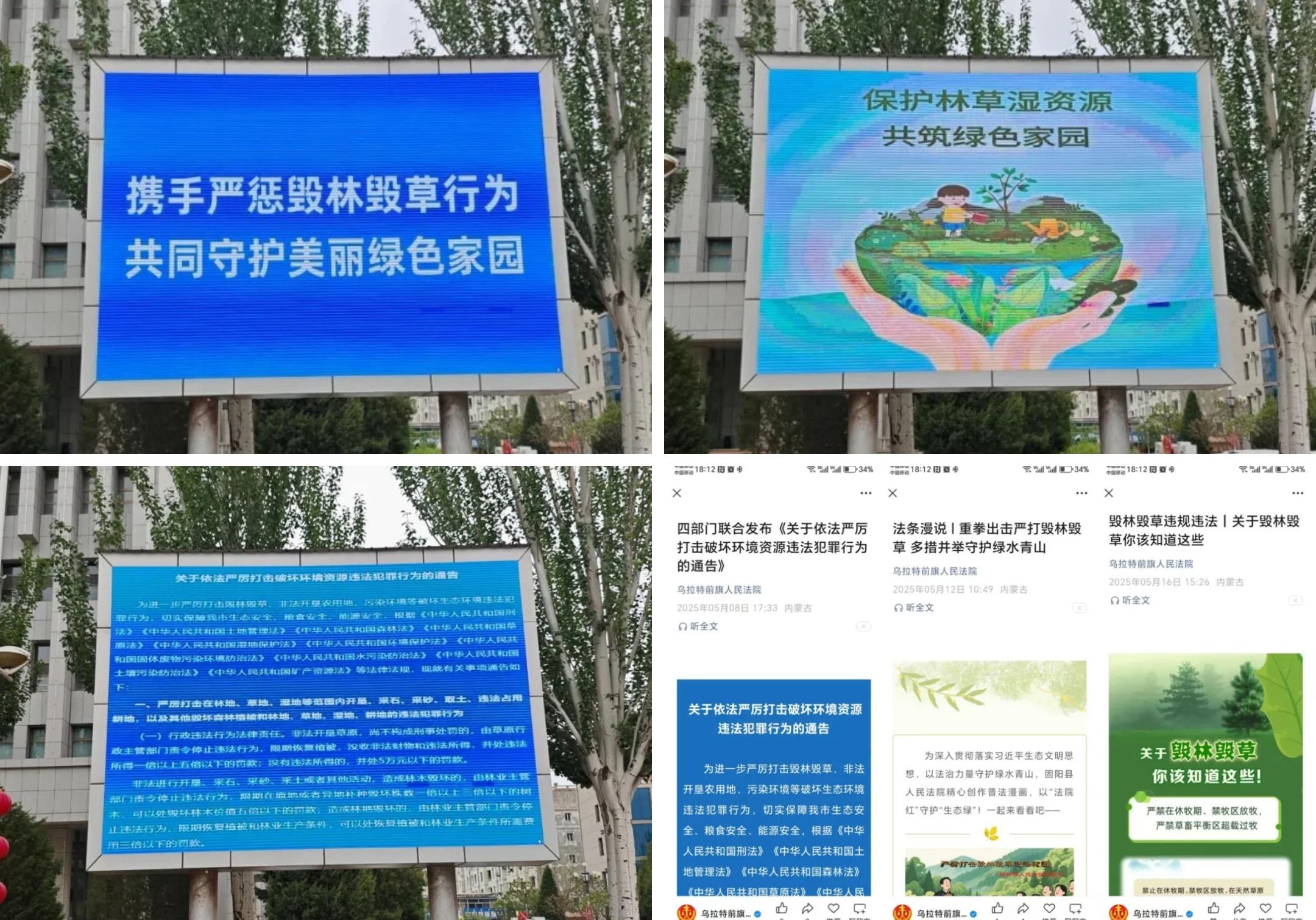 為鞏固宣傳成效,營造濃厚宣傳氛圍,烏拉特前旗人民法院開展了形式多樣的宣傳舉措。一是利用戶外LED電子顯示屏圍繞毀林毀草主題每日循環(huán)播放圖片及視頻;二是同時在5個基層法庭公示欄等顯眼位置張貼《關(guān)于嚴厲打擊毀林毀草違法犯罪行為的通告》等海報10余張;三是積極利用微信公眾號等多媒體平臺,轉(zhuǎn)發(fā)有關(guān)毀林毀草的相關(guān)文章及法律條文,引導群眾從“被動守法”轉(zhuǎn)向“主動護綠”。