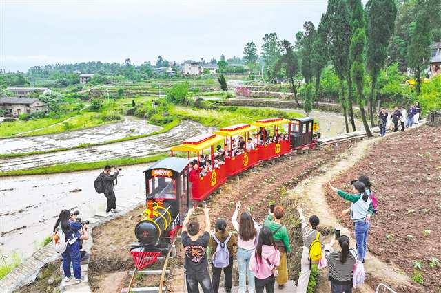 4月25日,綦江區(qū)古南街道花壩村,游客乘坐田園小火車。記者 龍帆 攝