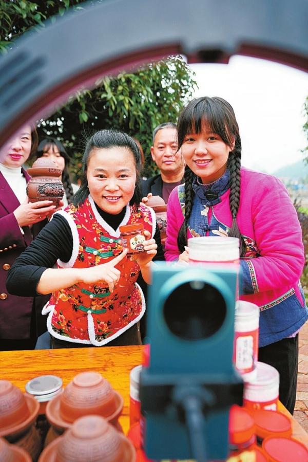 “新農(nóng)人”曾慶歡(右)將手機(jī)當(dāng)作新農(nóng)具,利用直播帶貨幫助村民銷售農(nóng)特產(chǎn)品。記者 易昂 攝