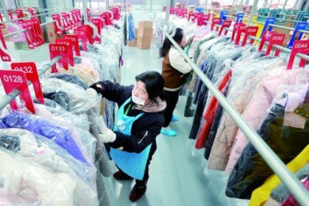 在她身后,數(shù)十臺(tái)清洗設(shè)備同時(shí)運(yùn)轉(zhuǎn),另一側(cè),洗凈消毒后的衣服按照客戶(hù)下單平臺(tái)分類(lèi)掛放,穿行其間,如同走在“叢林”一般?!疤煸絹?lái)越熱,基本上過(guò)了高峰期,高峰期每天收衣在6000件以上?!惫S負(fù)責(zé)人張磊介紹,去年,工廠訂單突破50萬(wàn)件,產(chǎn)值達(dá)450萬(wàn)元,向社區(qū)居民提供80余個(gè)就業(yè)崗位,人均增收3.5萬(wàn)元。