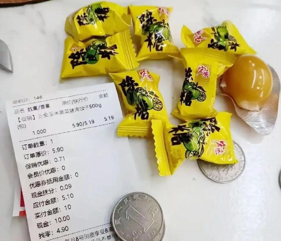 日前,有一位河北的網(wǎng)友發(fā)帖稱,其家附近一家知名連鎖零食店用現(xiàn)金購物,結(jié)賬時(shí)店員卻用陳皮糖“找零”。該網(wǎng)友曬出的購物小票及“找零”情況顯示:訂單原價(jià)5.90元,促銷優(yōu)惠0.71元,現(xiàn)金抹分0.09元,應(yīng)付金額5.10元,實(shí)付現(xiàn)金10元,找零4.90元。不過店家的“找零”并非4.9元現(xiàn)金,而是4個(gè)1元的硬幣、7顆陳皮糖及一個(gè)鵪鶉蛋。