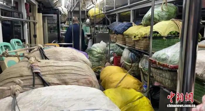 圖為菜農(nóng)將蔬菜等搬上公交車。楊凱茗 攝