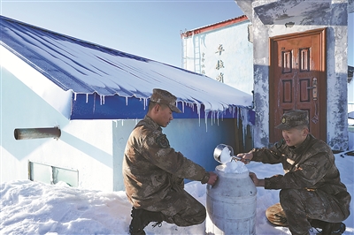 上等兵呂勝超、林元就近取雪,準備為戰(zhàn)友們燒洗臉水。
