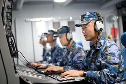 5月2日,中國海軍第35批護(hù)航編隊(duì)官兵在操控臺上發(fā)出指令。江山 攝