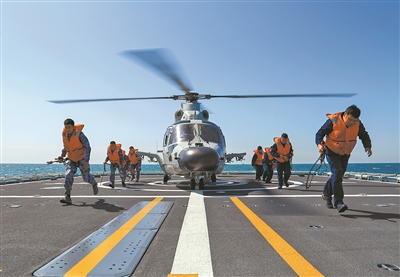 圖為艦載直升機(jī)緊急起飛。