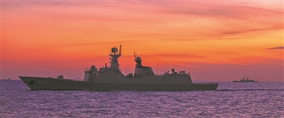圖為夜幕降臨,艦艇編隊(duì)逐浪前行。