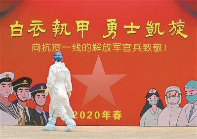 上圖:4月5日,在武漢泰康同濟醫(yī)院,護送一名新冠肺炎治愈患者出院后,軍隊支援湖北醫(yī)療隊隊員葉洪江從院區(qū)內的展板前走過返回病房。