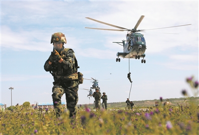 圖為直升機(jī)飛抵目標(biāo)區(qū)域上空,特戰(zhàn)隊(duì)員索降而下。張曦 攝