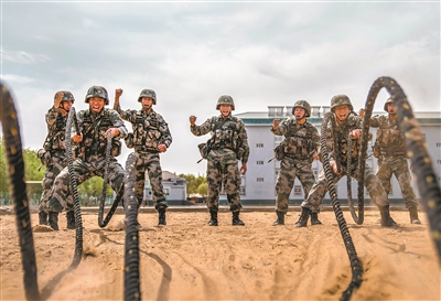 圖③:王宜征(前左)與戰(zhàn)士進(jìn)行甩繩體能比拼。