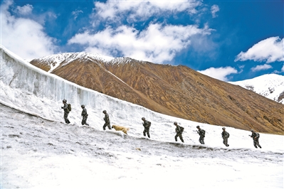 巡邏官兵翻越雪山達(dá)坂艱難前行。