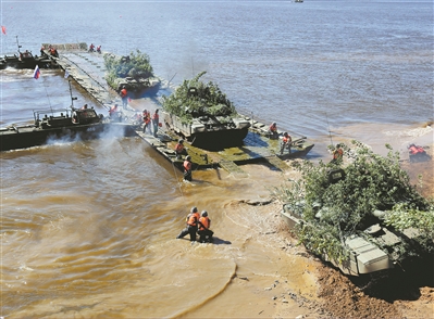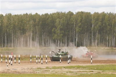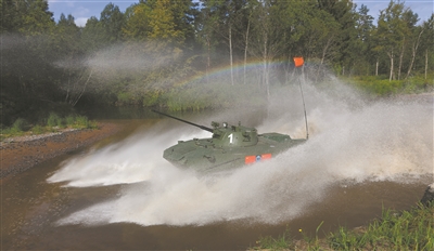 8月25日,“空降排”項(xiàng)目第二階段戰(zhàn)車單車賽展開激烈角逐,首次使用俄方戰(zhàn)車的我軍參賽隊快速通過淺灘障礙。