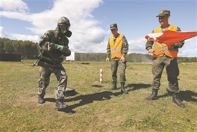 “安全環(huán)境”項(xiàng)目比賽前,我軍參賽隊員(左)進(jìn)行單組賽適應(yīng)性訓(xùn)練。傅道永攝