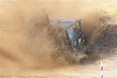 8月27日,在“汽車能手”項(xiàng)目接力賽中,我軍參賽隊員駕車通過泥坑路段。王世民攝