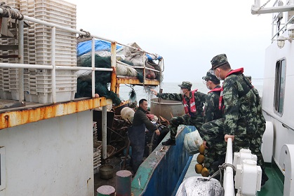 圖為海警執(zhí)法員對可疑船只進(jìn)行登臨檢查。江壯志 攝