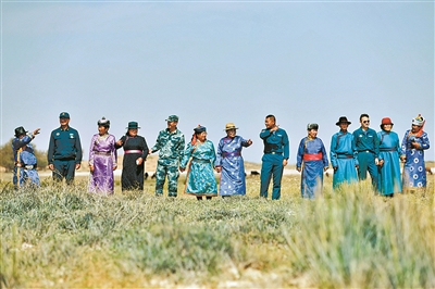 圖②:官兵和草原牧民感受飛播帶來(lái)的生態(tài)變化。