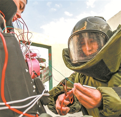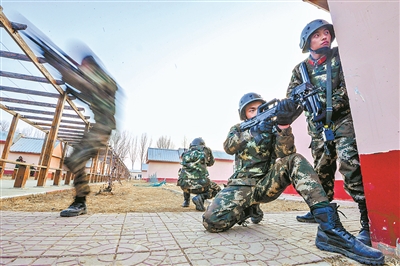 演訓場上,其他演練課目接連展開,砥礪官兵實戰(zhàn)能力。某大隊應(yīng)用激光模擬對抗系統(tǒng),組織紅藍對抗;排爆分隊設(shè)置復(fù)雜現(xiàn)場環(huán)境,排除“人質(zhì)”身上捆綁的“爆炸物”;偵察分隊實施抵近偵察,開展突入房屋訓練……