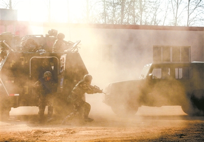 導(dǎo)調(diào)組下達“敵情”通報:“‘暴恐分子’駕駛一輛越野車企圖沖擊我執(zhí)勤卡點,迅速對其實施攔阻……”特戰(zhàn)隊員搭乘防暴裝甲車前去處置,途中遇到“暴恐分子”駕車加速沖來。在距離不足兩米遠的地方,裝甲車駕駛員猛地轉(zhuǎn)向、剎車,橫擋在越野車前方將其截停。官兵隨即沖下車,將“暴恐分子”一舉抓獲。
