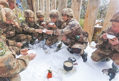 又走了4個小時,夜色中到達宿營地。大家撿來一些干枯的樹枝,生火做飯。晚來天寒,官兵們頭頂塑料布擋住雨雪,身下墊著樹葉展開睡袋和衣而臥。戰(zhàn)士們睡在靠近火堆的地方,侯云則把鋪蓋搬到了最邊上。