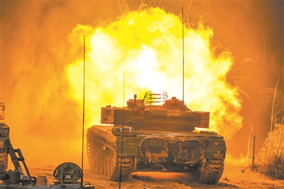 “全車注意!沖擊!……”考核現(xiàn)場(chǎng),各車組官兵駕乘坦克高速駛?cè)肷鋼襞艿溃谛羞M(jìn)中密切協(xié)同,對(duì)隨機(jī)出現(xiàn)的目標(biāo)進(jìn)行快速搜索判別,并根據(jù)目標(biāo)種類選擇不同彈種實(shí)施打擊。
