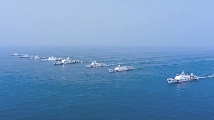 汕頭、揭陽、潮州海警局艦艇編隊單橫隊型航行。
