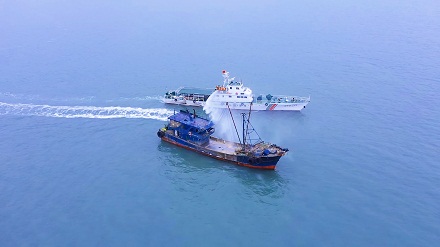 海警艦艇對嫌疑船舶進(jìn)行拖帶。