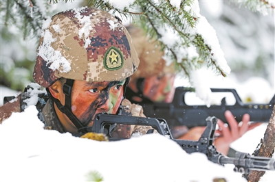 馬乾(左一)與戰(zhàn)友們在雪地潛伏。