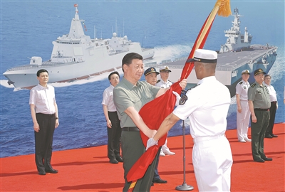 下午3時(shí)30分許,交接入列儀式開始,全場高唱中華人民共和國國歌,五星紅旗冉冉升起。儀仗禮兵護(hù)衛(wèi)著八一軍旗、命名證書,正步行進(jìn)到主席臺前。習(xí)近平將八一軍旗、命名證書分別授予長征18號艇艇長、政治委員,大連艦艦長、政治委員,海南艦艦長、政治委員。三型艦艇的艦艇長、政治委員向習(xí)近平敬禮,從習(xí)近平手中接過八一軍旗、命名證書。習(xí)近平同他們合影留念。