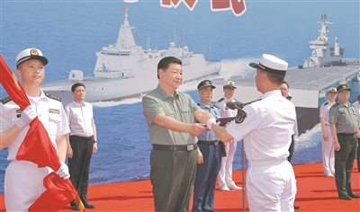 4月23日,海軍三型主戰(zhàn)艦艇——長征18號艇、大連艦、海南艦在海南三亞某軍港集中交接入列。中共中央總書記、國家主席、中央軍委主席習(xí)近平出席交接入列活動(dòng)并登上艦艇視察。這是習(xí)近平向大連艦授予軍旗、命名證書。 本報(bào)記者 范顯海 攝