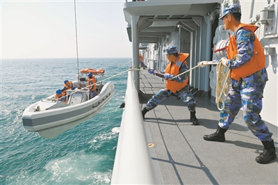 吊放小艇,開(kāi)展救生演練。