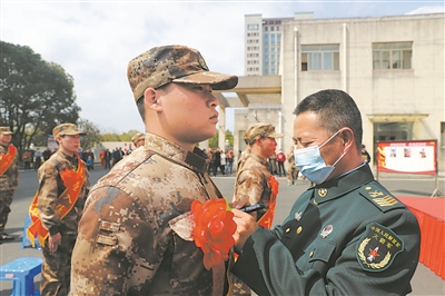 王忠心為新兵佩戴大紅花。武時(shí)化 攝