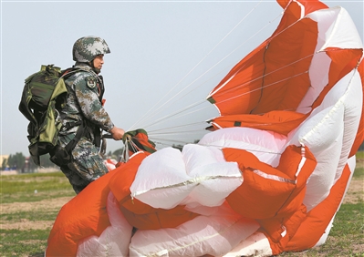 特戰(zhàn)隊員精準(zhǔn)著陸后快速收傘。