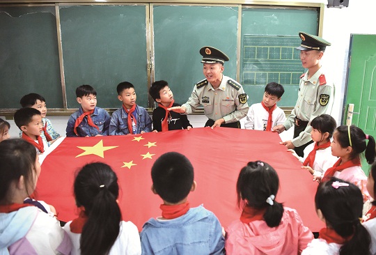 圖為武警官兵給小學(xué)生講述國(guó)旗故事。