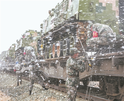 千里機(jī)動(dòng)至演練地域后,官兵頂風(fēng)冒雪卸載車(chē)輛裝備。