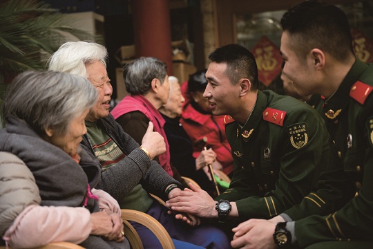 圖為武警上海總隊(duì)執(zhí)勤第四支隊(duì)執(zhí)勤十中隊(duì)官兵到黃浦老年公寓開展服務(wù)。揭亦凡 攝