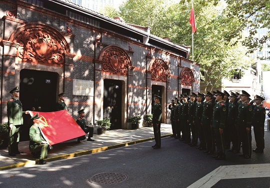 圖為武警上海總隊(duì)執(zhí)勤第四支隊(duì)執(zhí)勤十中隊(duì)官兵在中共一大紀(jì)念館前重溫入黨誓詞。徐延鈞 攝
