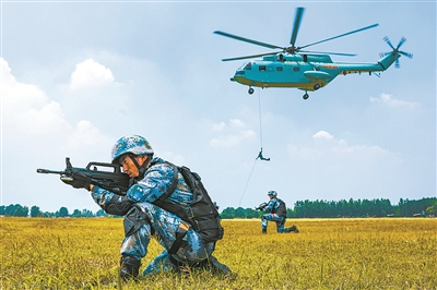 懸停、開艙、滑降……戰(zhàn)機(jī)到達(dá)作戰(zhàn)地域上空后,突擊隊(duì)員迅速出艙滑降,動(dòng)作一氣呵成,猶如神兵天降。落地后,在突擊組組長指揮下,隊(duì)員們密切協(xié)同,以迅雷不及掩耳之勢對“敵”發(fā)起攻擊。