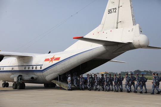 圖為參加“海上登陸”項目比賽官兵登機前往俄羅斯。肖勇利 攝