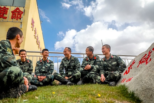 圖為楊富祥在海拔4868米的執(zhí)勤七中隊2號哨跟戰(zhàn)士們一起談心。楊浩 攝