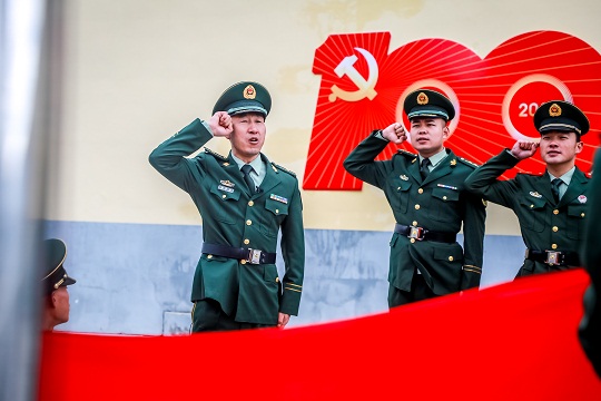 圖為慶祝建黨100周年時楊富祥(左一)向黨旗宣誓。楊浩 攝