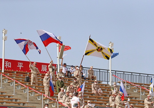 旌旗迎風(fēng)招展,和平友誼同筑。白俄羅斯、埃及、俄羅斯、烏茲別克斯坦、委內(nèi)瑞拉、越南參賽代表隊(duì)依次入場(chǎng)。當(dāng)一面面不同國(guó)家的國(guó)旗通過(guò)觀(guān)禮臺(tái)時(shí),現(xiàn)場(chǎng)官兵熱烈鼓掌,對(duì)遠(yuǎn)道而來(lái)的參賽隊(duì)員表示歡迎。東道主中國(guó)參賽代表隊(duì)最后一個(gè)入場(chǎng),參賽隊(duì)員們軍容嚴(yán)整、精神抖擻,在五星紅旗引領(lǐng)下通過(guò)觀(guān)禮臺(tái)。