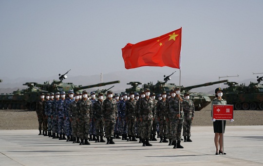 圖為8月22日,“國(guó)際軍事比賽-2021”中國(guó)庫(kù)爾勒賽區(qū)在“蘇沃洛夫突擊”比賽場(chǎng)正式開(kāi)幕,中國(guó)人民解放軍代表隊(duì)整齊列隊(duì)。新華社發(fā) 郭中正 攝
