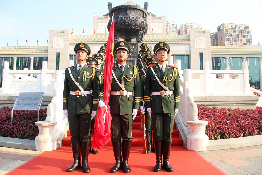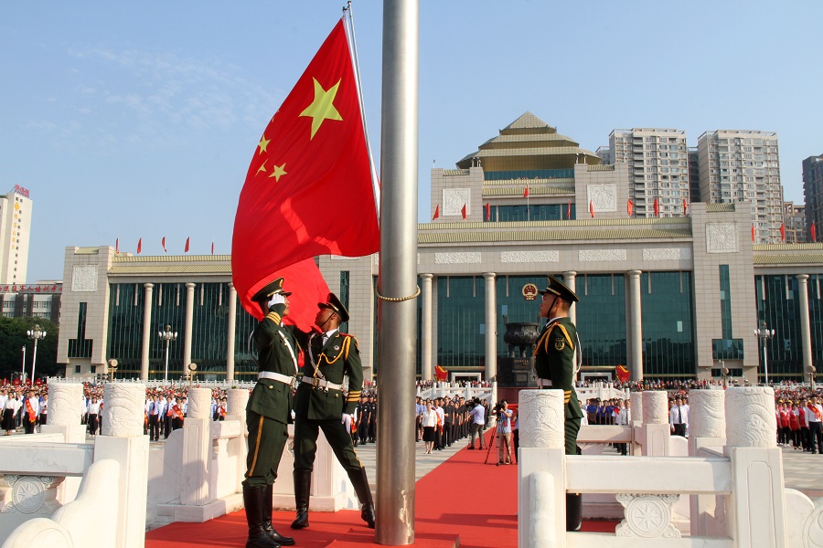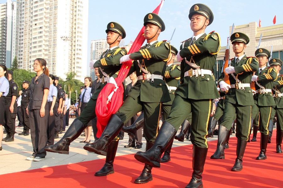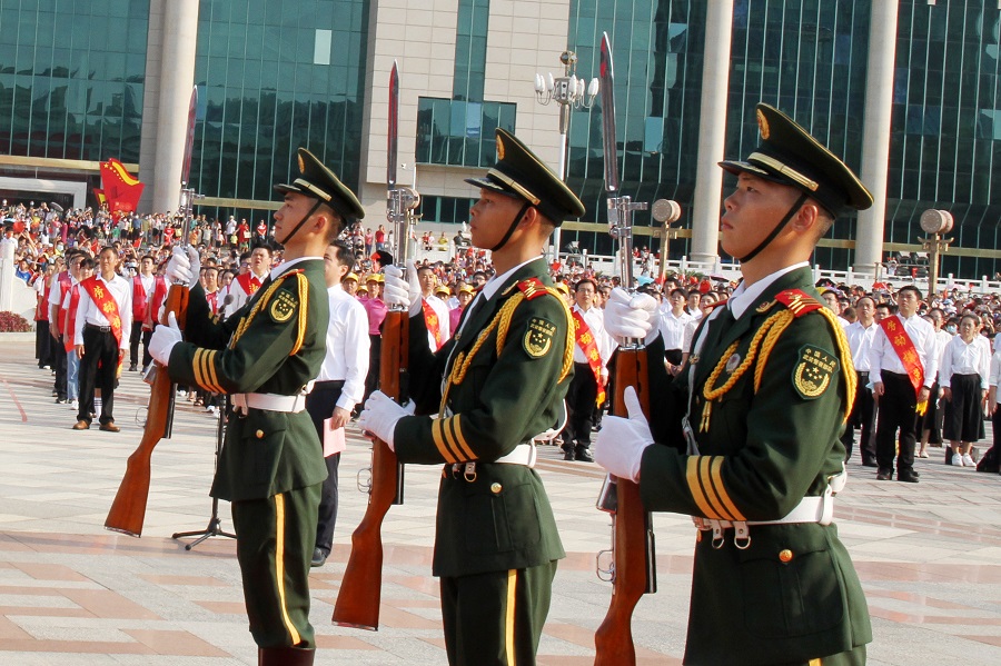 10月1日,在廣西壯族自治區(qū)南寧市,不少市民一大早就趕到民族廣場(chǎng)觀看升旗儀式,由武警廣西總隊(duì)南寧支隊(duì)15名官兵組成的國(guó)旗護(hù)衛(wèi)隊(duì)圓滿(mǎn)完成升旗任務(wù)。
