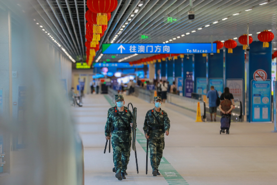 國慶節(jié)期間,在廣東省珠海市青茂口岸熙熙攘攘的人潮中,全副武裝的武警廣東總隊執(zhí)勤第二支隊某中隊官兵格外醒目。據(jù)統(tǒng)計,作為粵澳旅檢通關(guān)新通道的青茂口岸,自9月8日正式開通上勤以來,中隊官兵累計為300余名跨境旅客提供問詢、送藥等服務(wù)。