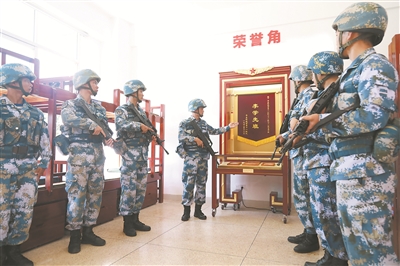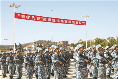 “賡續(xù)光榮傳統(tǒng),爭做‘李學(xué)先班’傳人……”軍委政治工作部為獲得重大榮譽的英模班排制作的榮譽柜下發(fā)部隊后,海軍陸戰(zhàn)隊某旅第一時間舉行榮譽柜發(fā)放儀式,為前身為“李學(xué)先班”的機步四連二班發(fā)放榮譽柜。