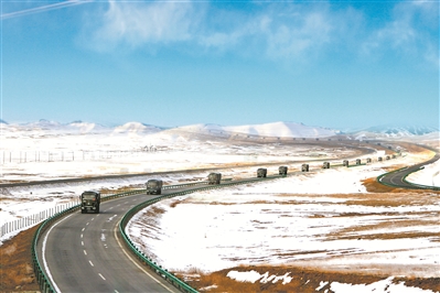 風(fēng)雪高原路,官兵駕車馳騁,一路向前。